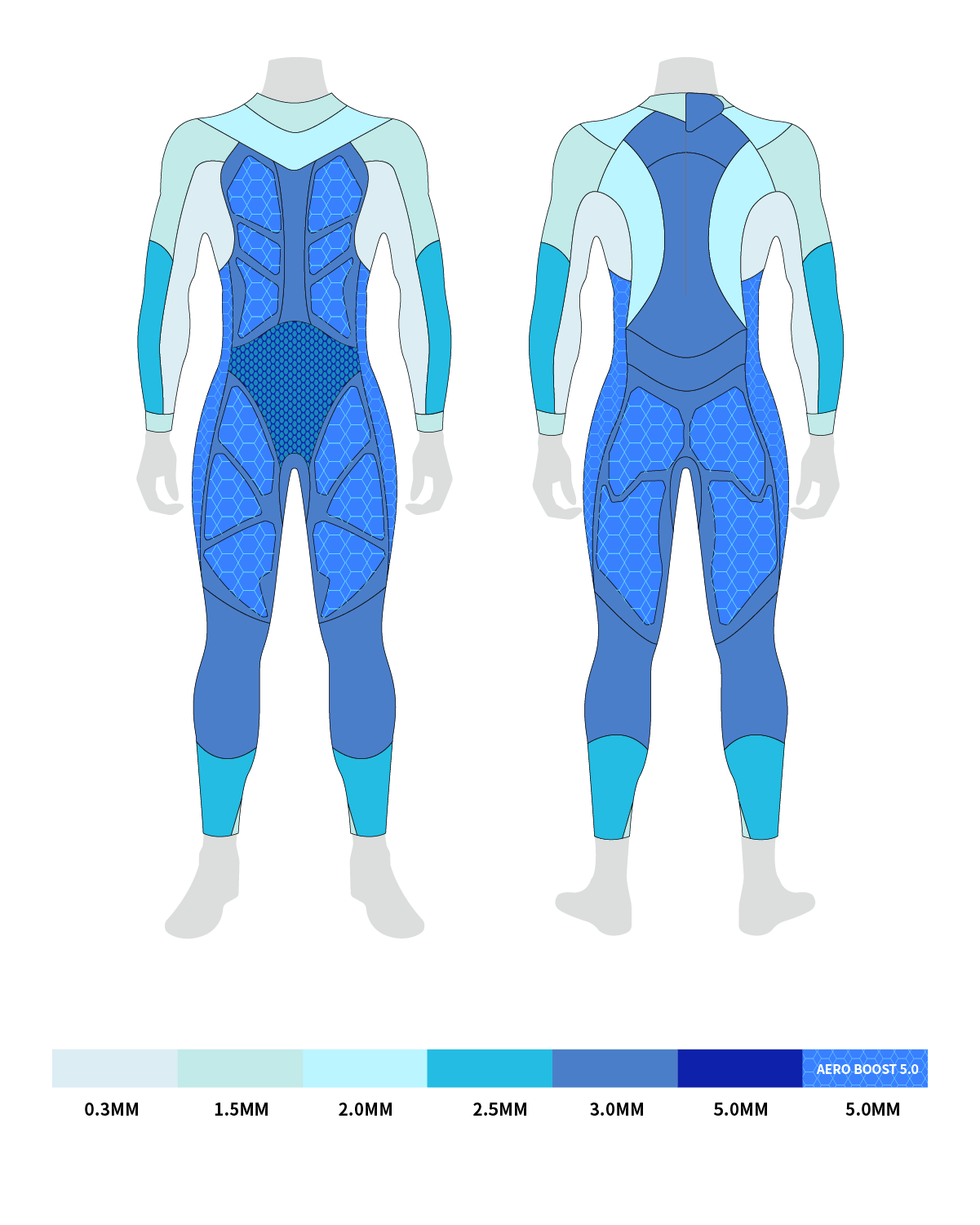 Die patentierte Aero Boost 5.0 Technologie bietet 30 % mehr Auftrieb als Aerodome. Dadurch sind unsere Neoprenanzüge 8 % schwimmfähiger als Neoprenanzüge mit Aerodome. Sie spüren den enormen Auftrieb im Wasser.