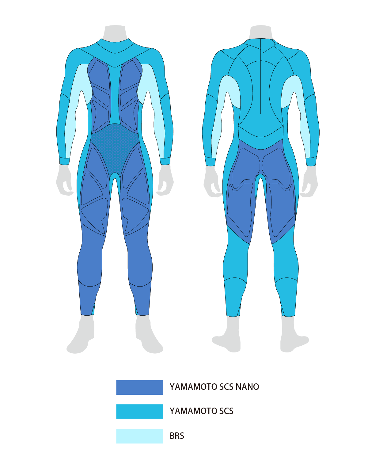 Die Yamamoto Nano SCS-Beschichtung bedeckt den Großteil des Neoprenanzugs. Die Beschichtung ist eine ultraglatte Oberflächenbeschaffenheit, die den Wasserwiderstand verringert und die hydrodynamischen Eigenschaften verbessert. Schwimmer können bei gleichem Kraftaufwand viel schneller schwimmen.