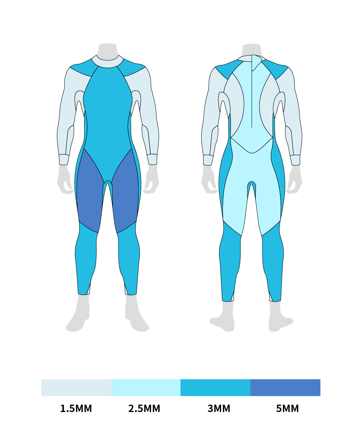 The combination of 1.5mm of Yamamoto #39 neoprene and SQ-Flex Stretch Inner Lining on the shoulders, sleeves, and armpits provides 580% elongation while swimming.