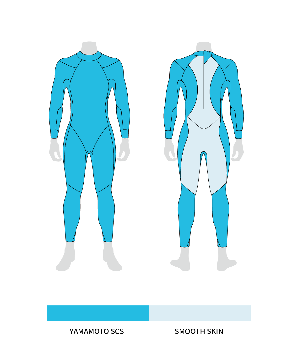 The Yamamoto SCS coating covers the majority of the wetsuit. The coating is a smooth finish which reduces water resistance and improves hydrodynamic properties. Swimmers can go faster with the same effort level.