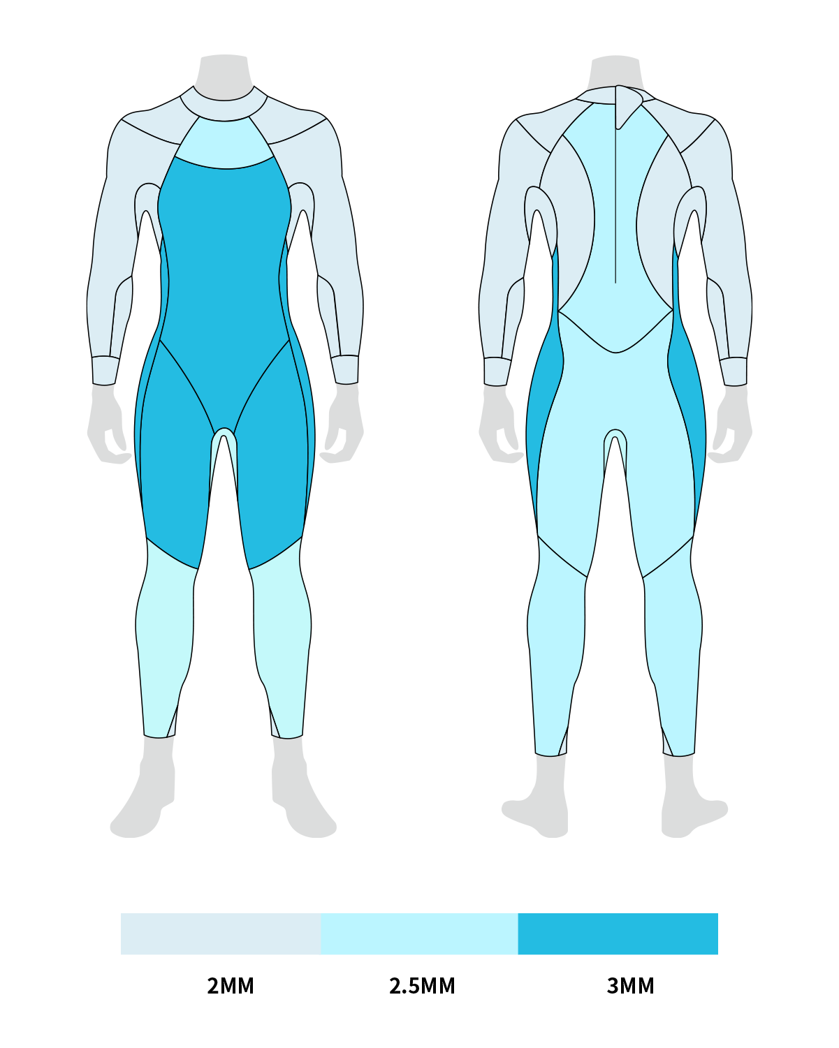 The combination of 2 mm of Yamamoto #39 neoprene and SQ-Flex Stretch Inner Lining on the shoulders, sleeves, and armpits provides 530% elongation while swimming.