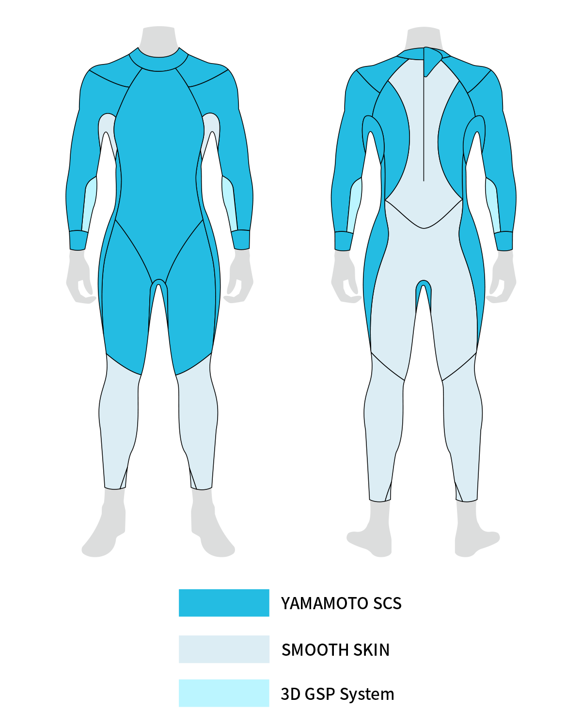 The Yamamoto SCS coating covers the entirety of the wetsuit. The coating is a smooth finish which reduces water resistance and improves hydrodynamic properties. Swimmers can go faster with the same effort level.
